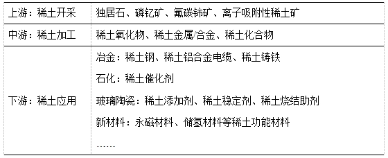 稀土產(chǎn)業(yè)鏈主要由稀土資源開(kāi)采,稀土材料制備,以及稀土應(yīng)用領(lǐng)域構(gòu)成。其中:稀土資源開(kāi)采主要涉及的稀土礦物有氟碳鈰礦、獨(dú)居石、磷釔礦,以及離子吸附性稀土礦;稀土材料制備包括精礦分解以及冶煉;稀土應(yīng)用領(lǐng)域包括冶金、軍事、石化、玻璃陶瓷、農(nóng)業(yè)、新材料等領(lǐng)域,是我國(guó)關(guān)鍵的戰(zhàn)略性資源。
