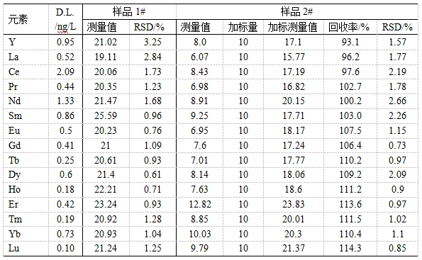 油田稀土示蹤劑主要用來(lái)考察油田井間的導(dǎo)通性,具有無(wú)放射性、安全穩(wěn)定、用量少、分析精度高等特點(diǎn)。將所得油田水樣搖勻過(guò)濾,稀硝酸稀釋一定倍數(shù),以內(nèi)標(biāo)法校正樣品基體對(duì)待測(cè)同位素影響,考察Y、La、Ce等15種稀土示蹤劑的檢出限、精密度(以RSD表示)、加標(biāo)回收率。發(fā)現(xiàn)檢出限為0.10~2.09ng/L;樣品1#的精密度為0.61%~3.25%;樣品2#中各元素加標(biāo)回收率為93.1%~114.3%,精密度為0.85%~2.66%。