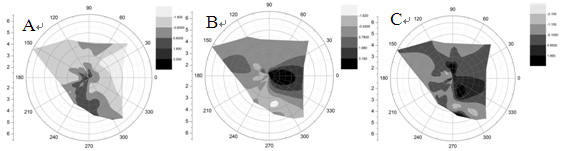圖6 EHM-X200大氣重金屬監(jiān)測(cè)儀監(jiān)測(cè)數(shù)據(jù)PM2.5中元素主成分分析得到的各組分與風(fēng)向關(guān)系圖。圖A是組分1(工業(yè)、生活燃料燃燒)的濃度與風(fēng)向關(guān)系圖,從圖中可以看出組分1主要來(lái)源于監(jiān)測(cè)點(diǎn)位的西南方向(深色區(qū)域);圖B是組分2(冶金工業(yè)廢氣)的濃度與風(fēng)向關(guān)系圖,從圖中可以看出組分2來(lái)源于監(jiān)測(cè)點(diǎn)自身范圍內(nèi)(深色區(qū)域);圖C是組分3(揚(yáng)塵)的濃度與風(fēng)向關(guān)系圖,從圖中可以看出組分3主要來(lái)源于監(jiān)測(cè)點(diǎn)位的東方及北方(深色區(qū)域)。圖中顏色深淺由淺到深代表污染的程度由小到大。
