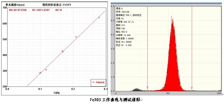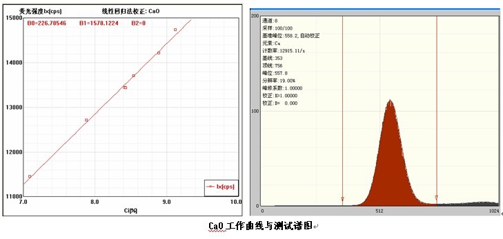 各個元素的工作曲線與測試譜圖,其中B0為曲線節(jié)距;B1:為曲線斜率;在測試譜圖中有元素的測試信息:計數(shù)率,采樣時間,分辨率等。