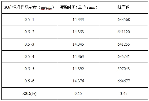 取0.5μg/L硫酸根標(biāo)準(zhǔn)溶液重復(fù)進(jìn)樣6次,考察保留時(shí)間和峰面積的重復(fù)性,RSD結(jié)果詳見(jiàn)表3。