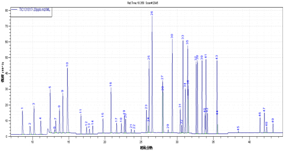 圖2. 54種揮發(fā)性有機(jī)物(VOCs)標(biāo)準(zhǔn)物質(zhì)在SIM模式下的TIC圖