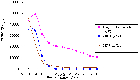 儀器首先在標(biāo)準(zhǔn)模式下進(jìn)行參數(shù)優(yōu)化(利用10μg·L-1的Li、Co、In、U、Ce調(diào)諧液對儀器工作參數(shù)進(jìn)行調(diào)節(jié),使儀器靈敏度高,同時(shí)氧化物及雙電荷產(chǎn)率小于3%);再開啟He/H2碰撞反應(yīng)氣,逐步增大He/H2流量,測試超純水、4%HCl及10μg·L-1 As(4%HCl介質(zhì))在75amu處的響應(yīng)信號,計(jì)算其背景等效濃度(詳細(xì)數(shù)據(jù)見表1及圖1);并利用As標(biāo)液進(jìn)一步優(yōu)化He/H2流量,得到儀器工作參數(shù)如表2所示。