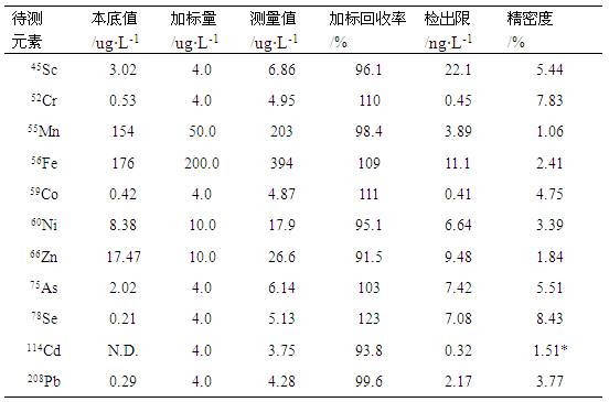 在儀器優(yōu)化工作參數(shù)條件下,對樣品溶液及加標(biāo)樣液進(jìn)行測試,計(jì)算其加標(biāo)回收率;對樣品空白溶液平行測定7次,以三倍空白信號標(biāo)準(zhǔn)偏差/靈敏度對應(yīng)的濃度為檢出限;同時(shí)對樣品溶液平行測定11次(間隔2min),計(jì)算其相對標(biāo)準(zhǔn)偏差,考察精密度,數(shù)據(jù)見表4。各元素檢出限在0.41-22.07ng/L之間,加標(biāo)回收率在93.82%-123.10%之間,精密度在1.06%-8.43%之間。