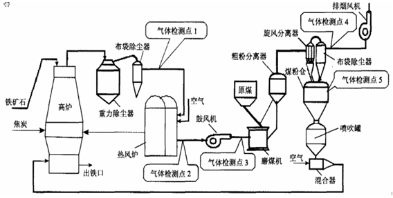 (1)監(jiān)測點1:高爐煤氣分析,CO和CO2,控制高爐爐況和回收能源氣;