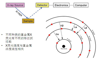 X射線(xiàn)熒光光譜技術(shù)(XRF)的原理見(jiàn)圖3所示,可以直接檢測(cè)固體或液體樣品中ppm量級(jí)的元素成分。采用富集后再檢測(cè)的辦法,使得XRF技術(shù)對(duì)空氣顆粒物中的重金屬成分的檢測(cè)限優(yōu)于0.001ug/m3。而常規(guī)實(shí)驗(yàn)室的檢測(cè)技術(shù),由于預(yù)處理消解過(guò)程中需要將微克量級(jí)的樣品溶解到幾十克的液體中,而使得濃度被稀釋百萬(wàn)倍,從而多數(shù)儀器(譬如ICP-AES、或原子吸收光譜儀)無(wú)法檢出元素含量低于10ug/m3量級(jí)的空氣顆粒物樣品。