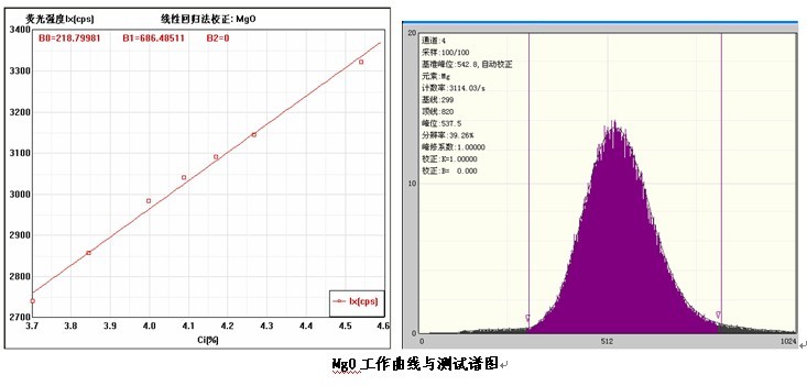 各個元素的工作曲線與測試譜圖,其中B0為曲線節(jié)距;B1:為曲線斜率;在測試譜圖中有元素的測試信息:計數(shù)率,采樣時間,分辨率等。