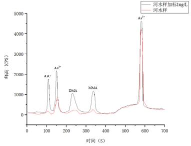 河水樣品及加標(biāo)1μg/L的測(cè)試結(jié)果詳見(jiàn)表4,樣品及加標(biāo)后砷形態(tài)疊加譜圖如圖5所示。